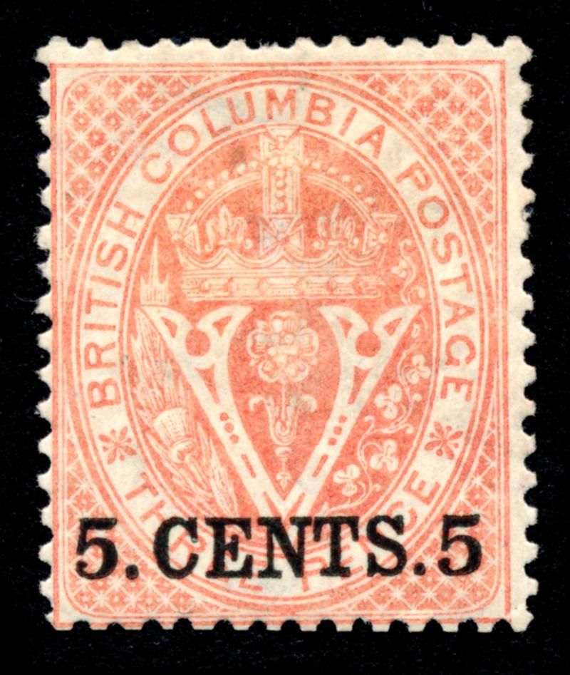 BRITISH COLUMBIA 1867-71 #9 STAMP F *. Coat of Arms issue, 5c on 3p, the stamp is mint, original gum with typical thin. 2025 certificate from Vincent Graves Greene Philatelic Research Foundation. Unitrade $300.00. (Image1)