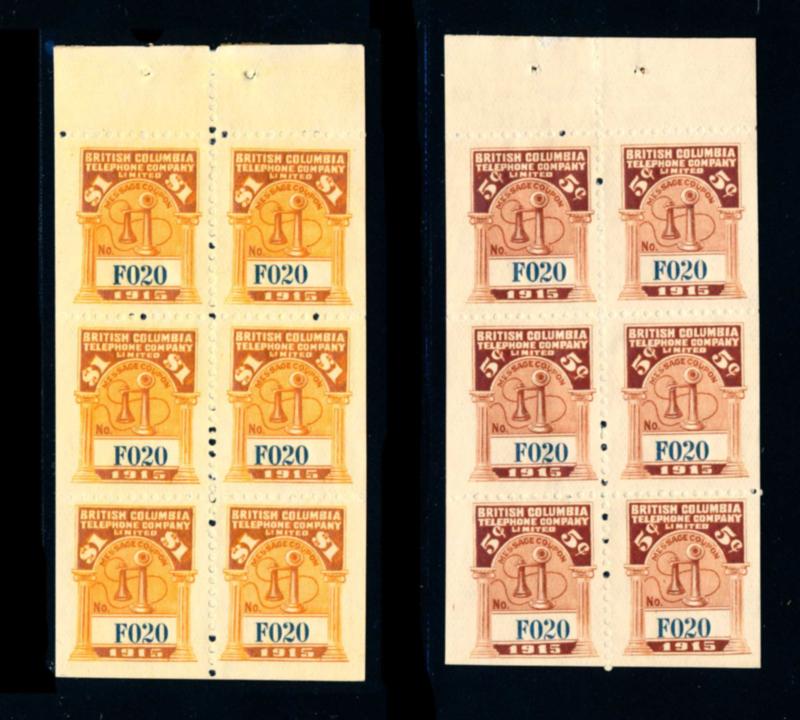 BRITISH COLUMBIA 1915 SMALL TELEPHONE FRANKS #BCT55+57 BOOKLET PANES VF (*). Selection of 2 booklet panes of 6 coupons complete with tab, mint without gum as issued. Van Dam $1150.00. (Image1)