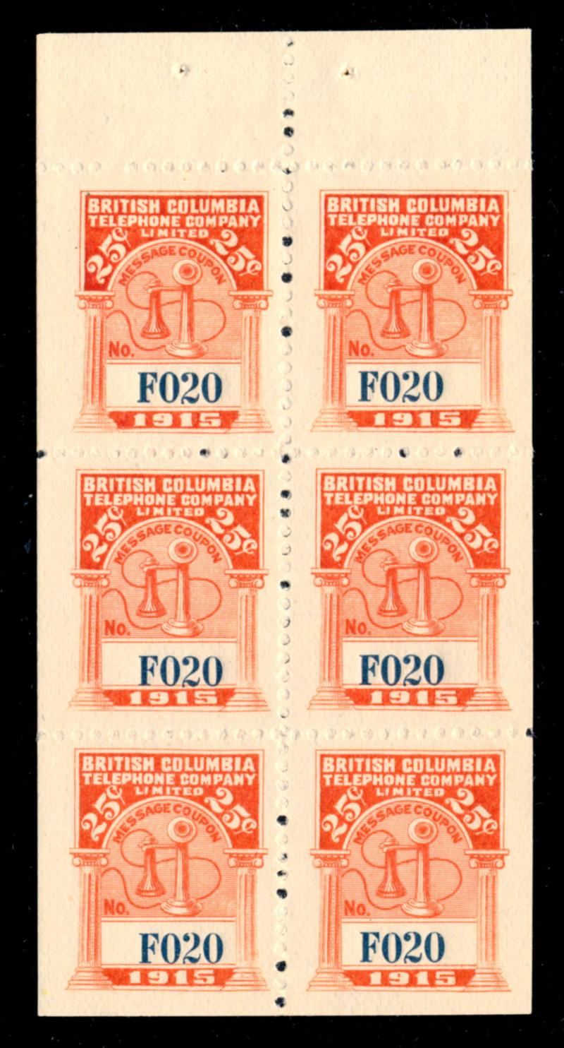 BRITISH COLUMBIA REVENUE 1915 #BCT56 BOOKLET PANE STAMPS VF (*). Complete booklet pane with tab of 6 Telephone Franks stamps mint without gum as issued. Van Dam catalog $245.00. (Image1)