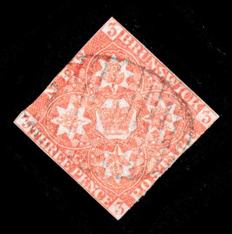 NEW BRUNSWICK 1851 #1 STAMP F /O. Coat of Arms issue, 3 pence red, the stamp is used, cut through frameline on left side with small thin under "WICK". 2025 certificate from Vincent Graves Greene Philatelic Research Foundation. Unitrade $350.00. (Image1)