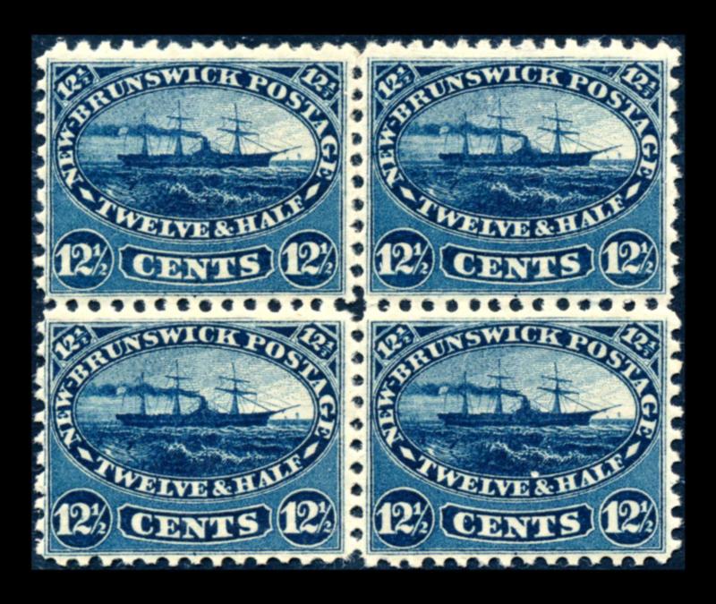 NEW BRUNSWICK 1860 #10 IN BLOCK STAMPS F-VF */**. Cents issue, 12 cents steamship in block of 4 mint, top stamps hinged and bottom stamps never hinged. Unitrade $580.00. (Image1)
