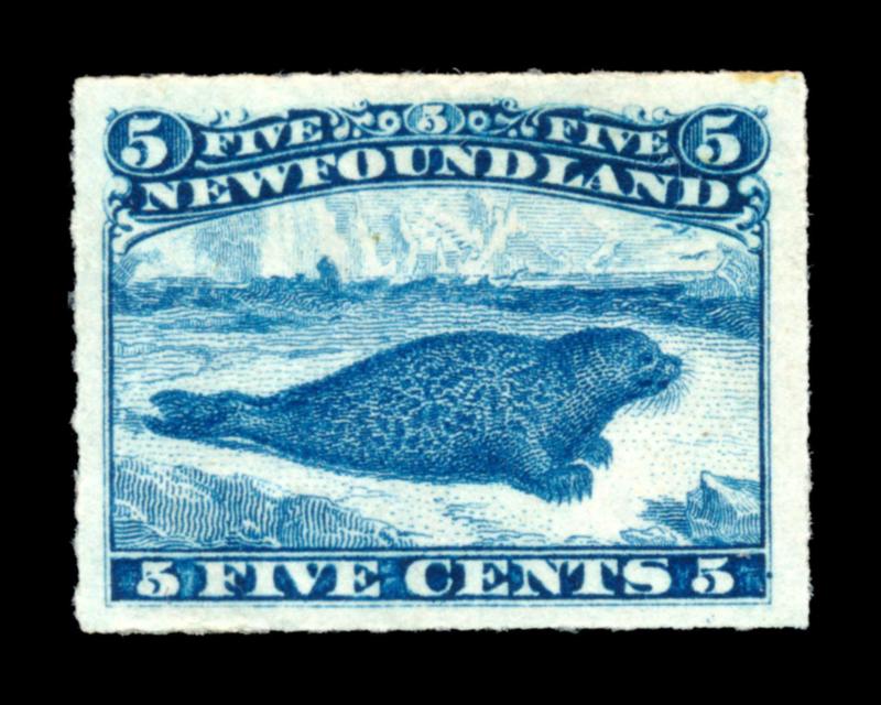 NEWFOUNDLAND 1876 #40 STAMP VF *. Five cents Harp seal, the stamp is very well centered and mint hinged. Very nice copy. Unitrade $400.00. (Image1)