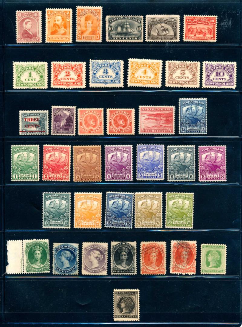 NEWFOUNDLAND + PROVINCES 1860-1949 COLLECTION, STAMPS F-VF */**/O. Binder with a nice collection of 432 stamps mint and used. I noted #20*, 24/o x2, 28/o, 29*, 30*, 35* x2, 39/o, 40/o x2, 41-43/o, 41-43*, 44-45*, 44-45/o, 46-48*, 51*, 52/o x2, 59/o, 69-74*, 115-126* (no #123), C9*, C13-17*. Also stamps from the provinces. High catalog value. Need to be examined. Starting price $130.00. (Image1)