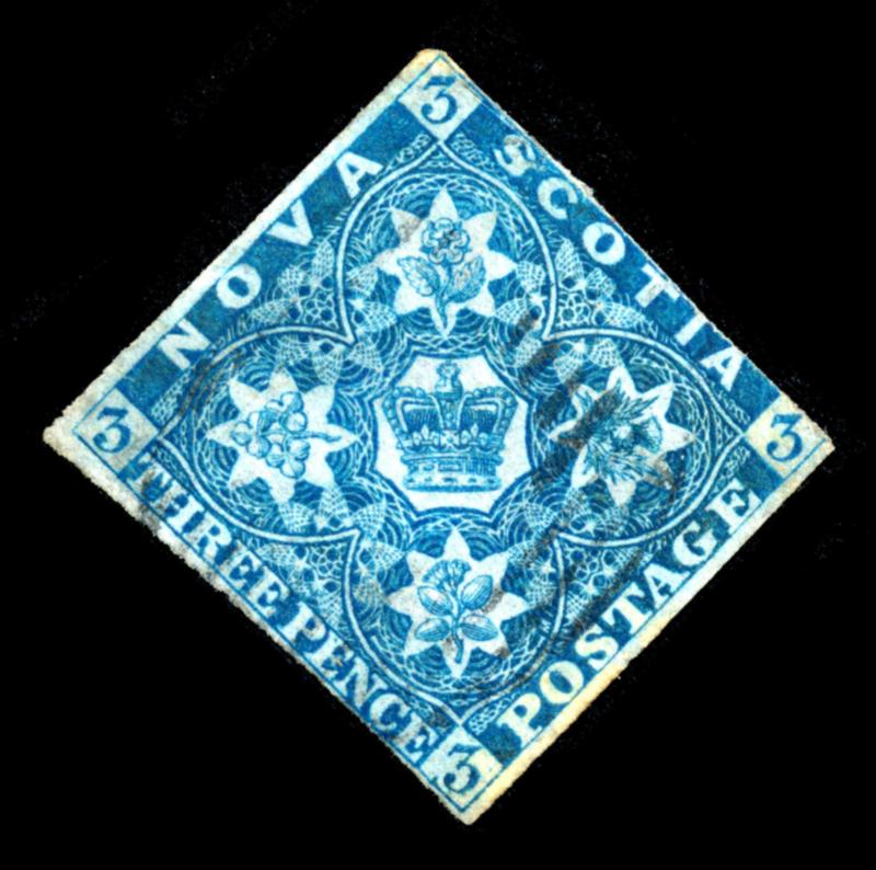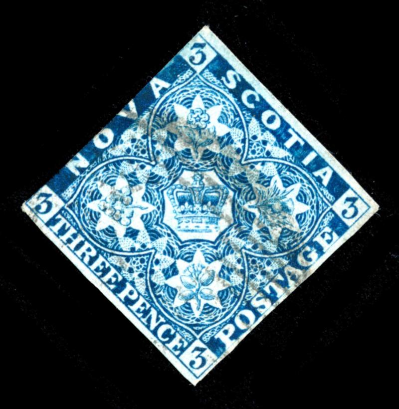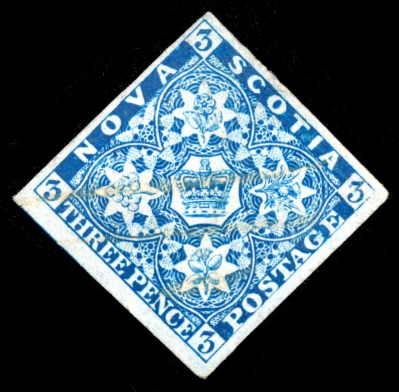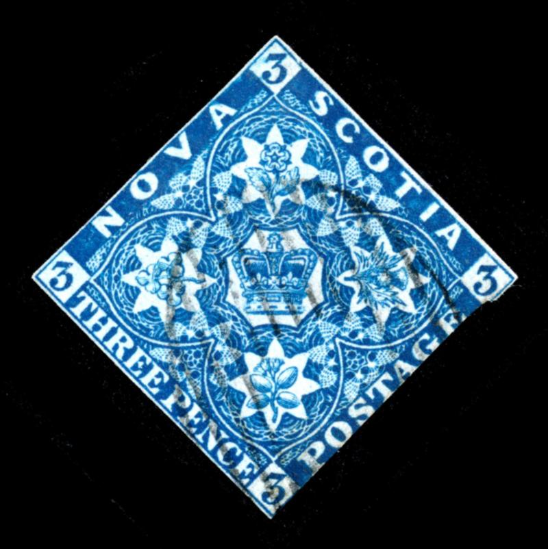 NOVA SCOTIA 1851 #3 STAMP F /O. Coat of Arms issue, 3 pence dark blue imperforate, the stamp is used, cut through frameline on top and small thin at bottom. 2025 certificate from Vincent Graves Greene Philatelic Research Foundation. Unitrade $200.00. (Image1)
