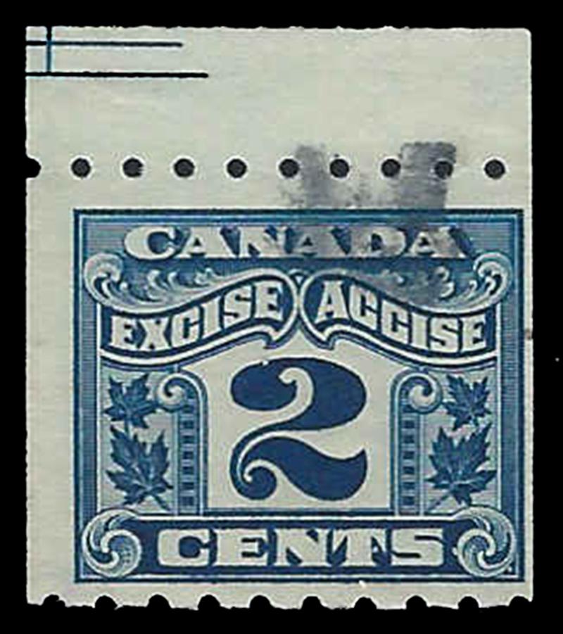 FX46var: 2¢ blue Two-Leaf COIL top TAB SINGLE with PYRAMID GUIDE ARROW in selvedge (from a paste-up pair), RARE. (Image)