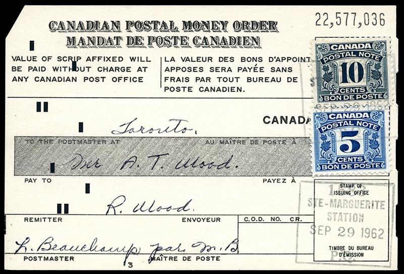FPS7,FPS12: 5¢ and 10¢ tied to Canada Post CANADIAN POSTAL MONEY ORDER STE-MARGUERITE STATION 29 SEP 1962 P.Q., very fine. (Image)