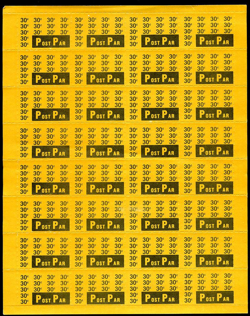 CANADA STRIKE, COURIER AND LOCAL POST: POST PAR INC.: P2: 30¢ black and orange on white paper, 100 complete sheets of 32, nh, mostly very fine. (Lafreniere $9600) (Image)