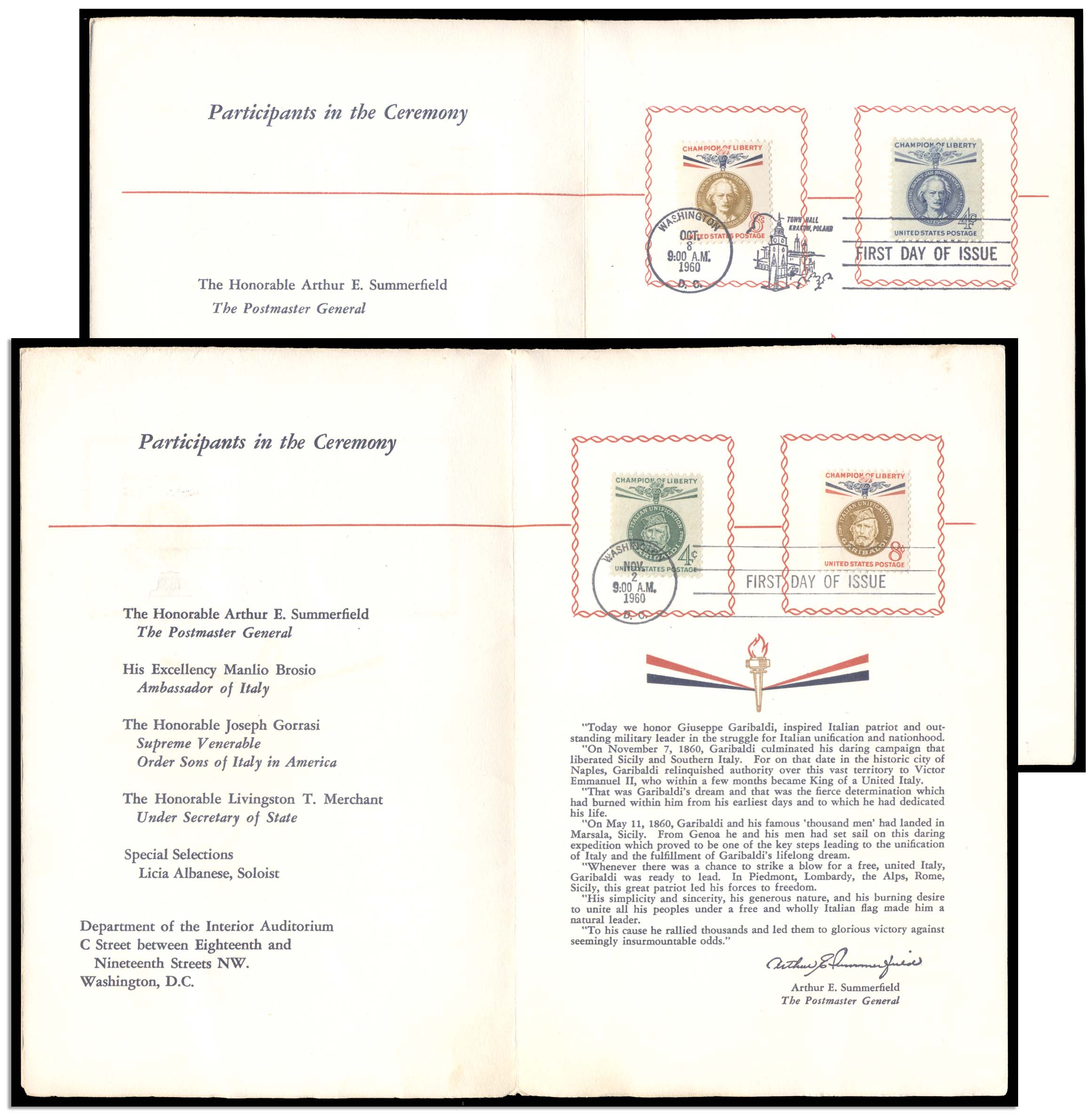 1159-60, 1168-9,4¢ and 8¢ Champions of Liberty (Paderewski and Garibaldi), First Day Ceremony Programs (2), programs have foxing stains Cat($30) (Image)