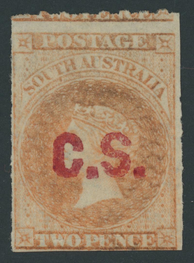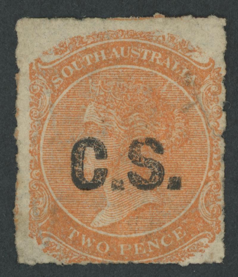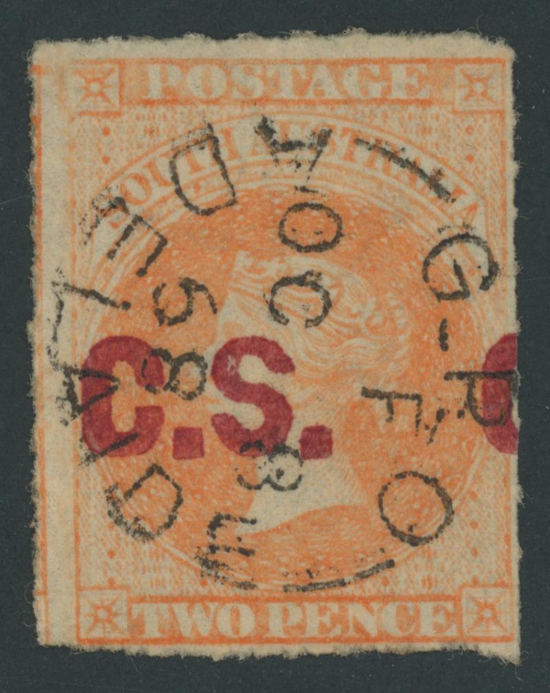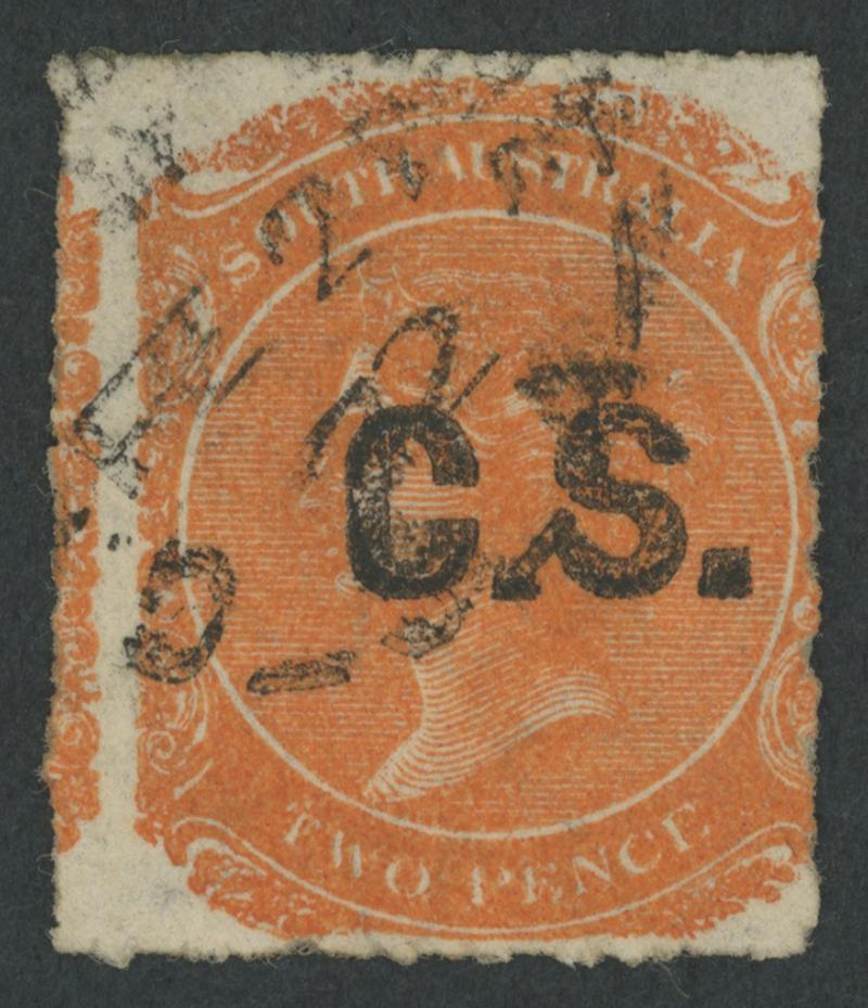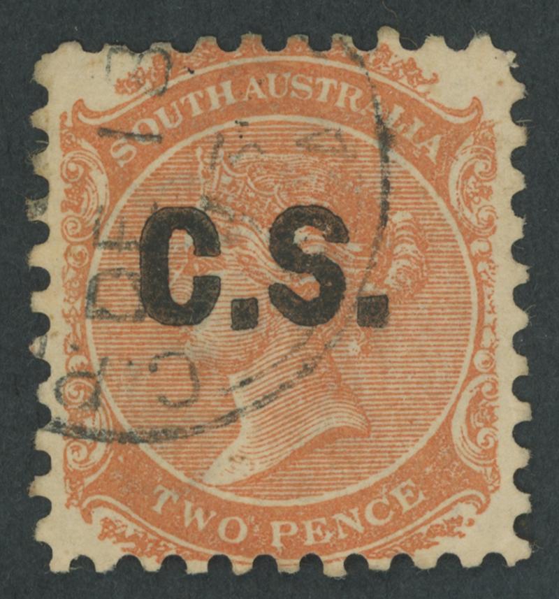 BLACK OVERPRINT: 'C.S.' on QV De La Rue Crown/SA Wmk Perf 10 2d dull orange SG DO153, well-centred, GPO cds of 'DE18/73', Cat £120. Rated RR; unrecorded unused. Ex Peter Kowald: sold for $405 (Sale 516). [Date range 24.4.1873 to 25.6.1874] (Image1)