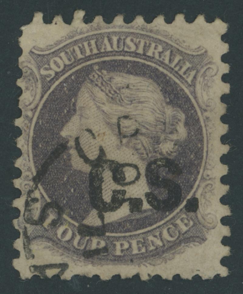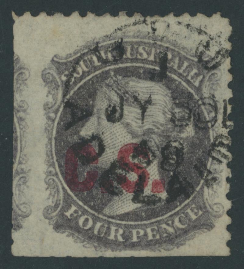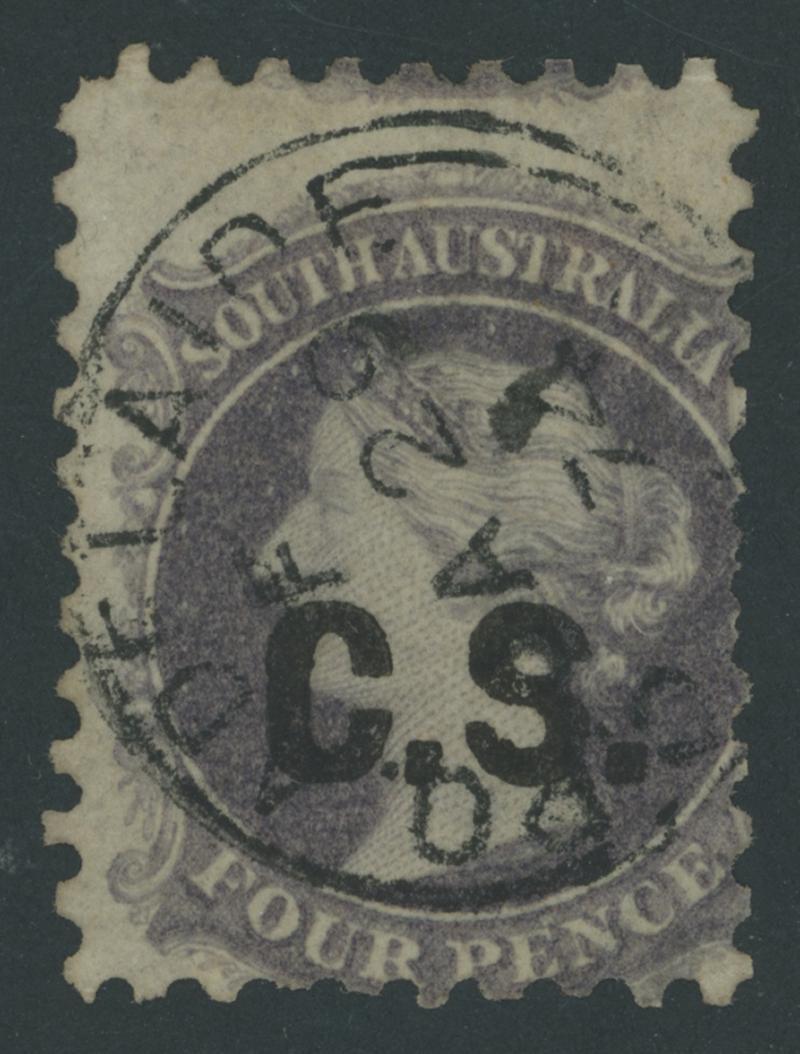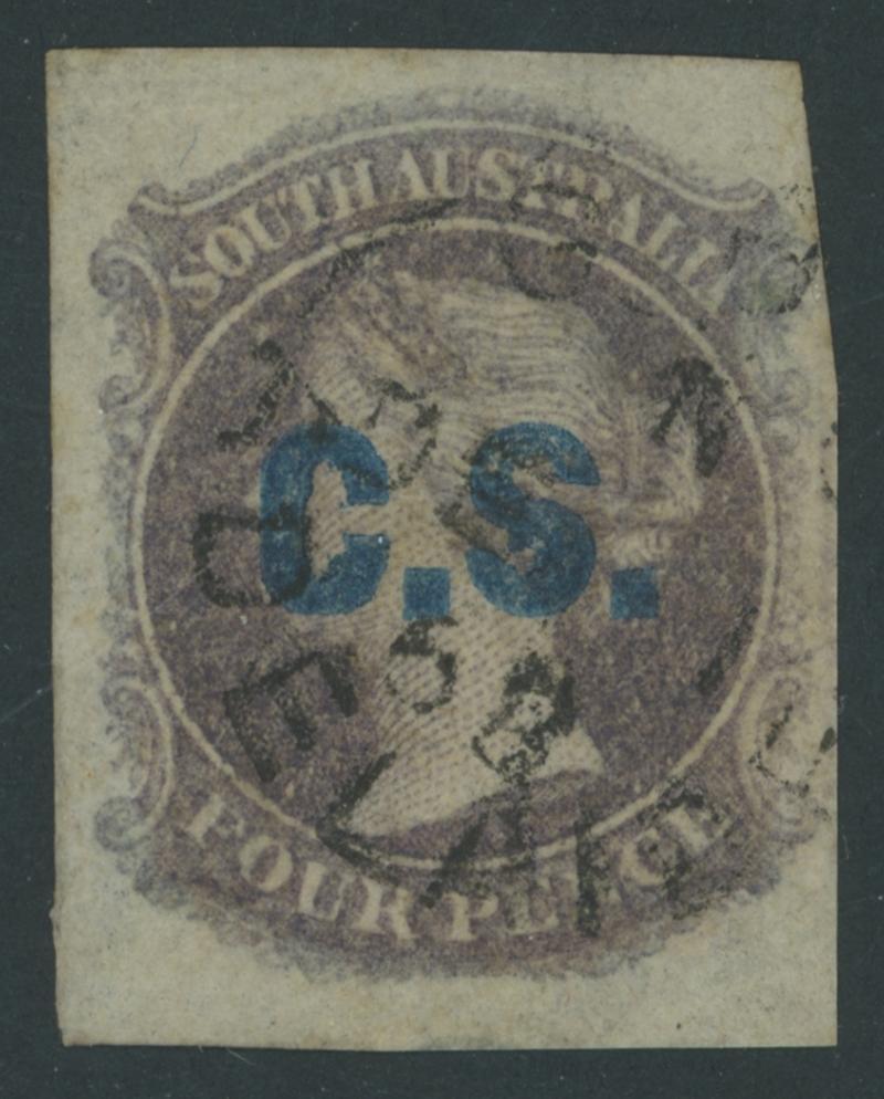 BLACK OVERPRINT: 'C.S.' on QV Perkins Bacon Large Star Wmk Regular Compound Perf 11½-12½x10 4d slate-violet SG DO157, light GPO cds of 'AP30/74', Cat £130. Rated RR; unrecorded unused. Ex Don Pearce: sold for $227 (Sale 247 Lot 106). [Date range 5.8.1873 to -.5.1874] (Image1)