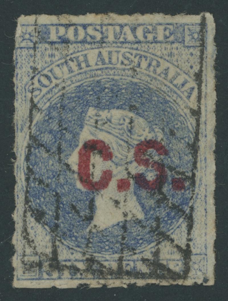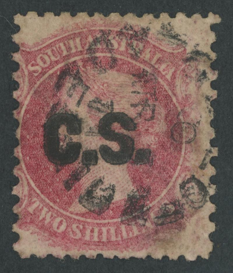BLUE OVERPRINT: 'C.S.' on QV De La Rue Crown/SA Wmk Rouletted 2d red-orange SG DO142, rouletting clear of the design on all sides, GPO cds of 'MY10/70', Cat £200. Underrated at S: unrecorded unused. More attractive than Don Pearce's superb example that sold for $227 (Sale 247 Lot 96). [Date range 10.5.1870 to 24.3.1873] (Image1)