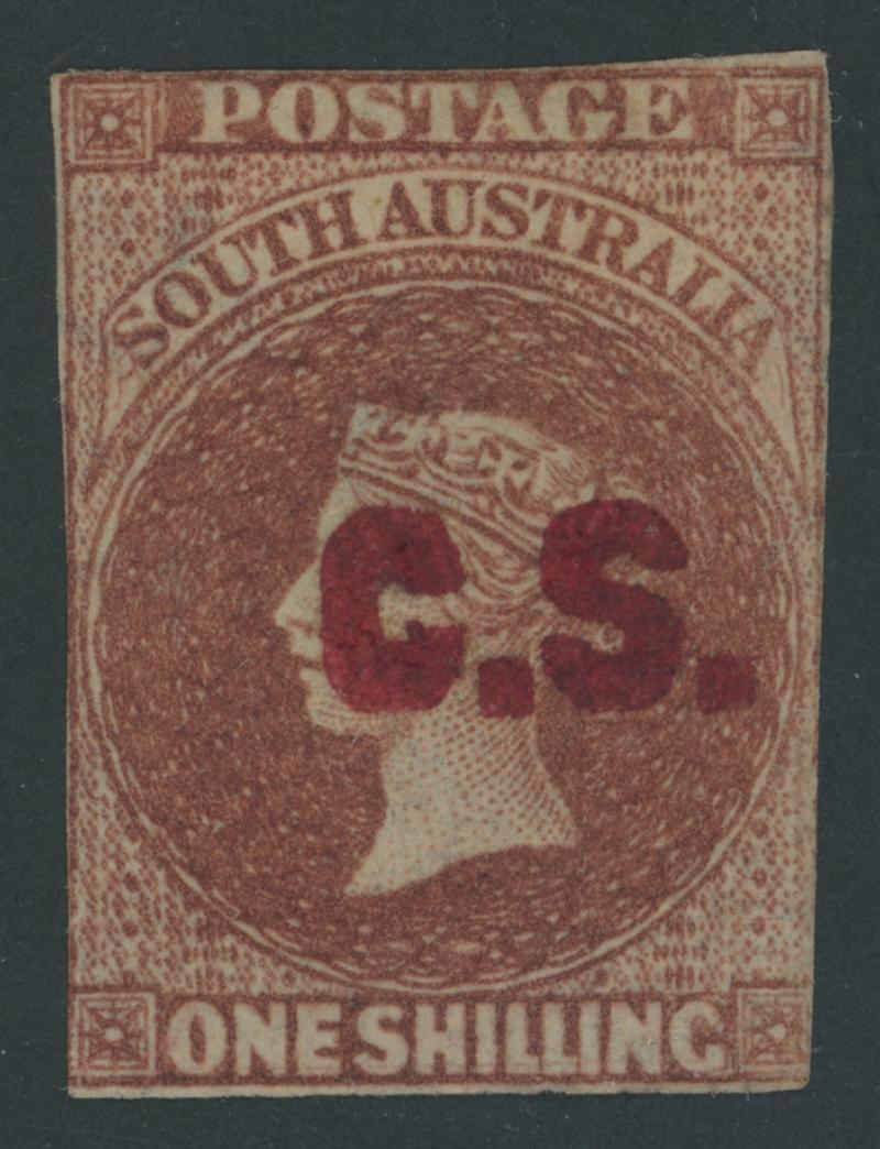 RED OVERPRINT: 'G.S.' (Error of Lettering for 'C.S.') on QV Perkins Bacon Large Star Wmk Rouletted 1/- red-brown SG DO140a, cut from the sheet clear of the design on all sides with no trace of rouletting and apparently Imperforate (see also Lot 190), untidy but light parcel-roller cancel, Cat £4500. Rated RRRR under Government Storekeeper but this and the next lot are the only recorded examples so it should be rated RRRRR. Ex Brown, Colonel Harry Napier and Don Pearce: sold for $7785 (Sale 247 Lot 91). RPSL Certificate (1965) issued many years before the 'G.S.' error was confirmed. One of the great errors - perhaps a double-error - of the Departmental series.