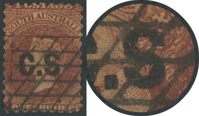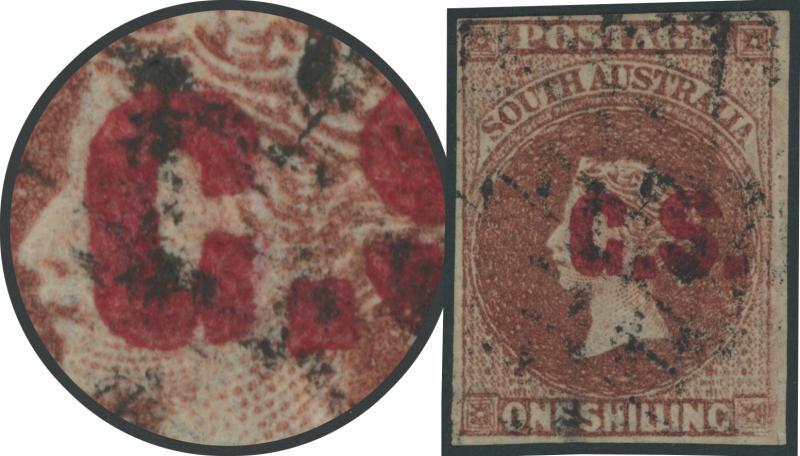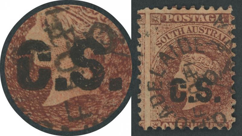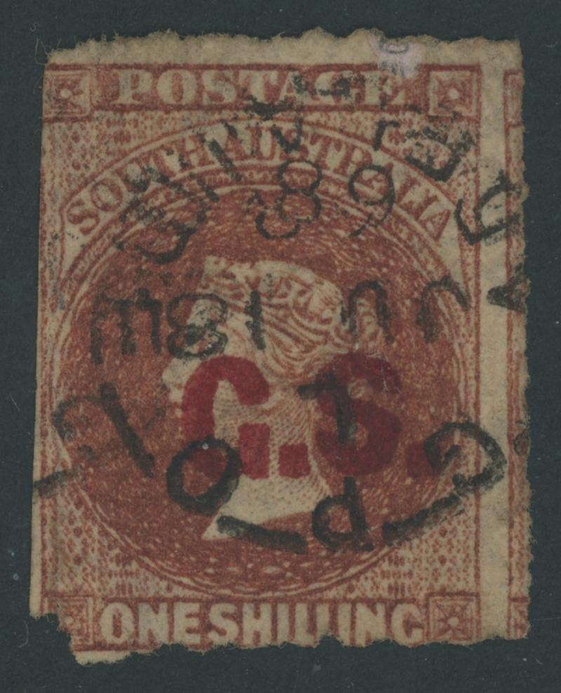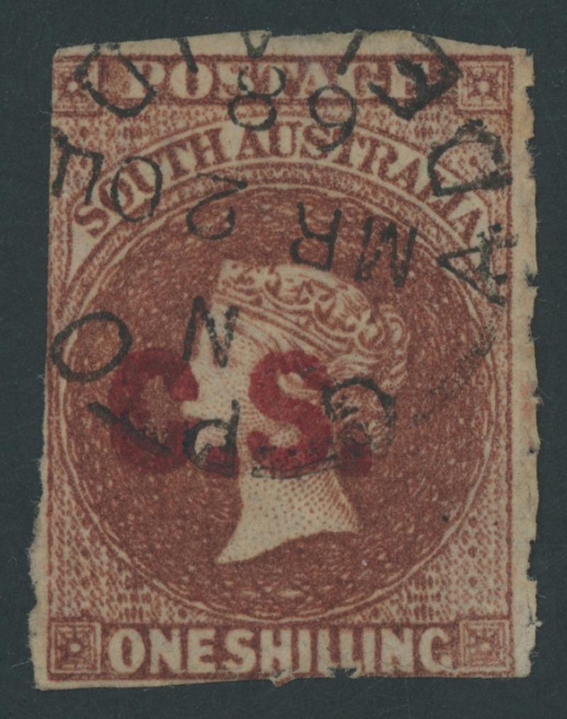 RED OVERPRINT: 'C.S.' on QV Perkins Bacon Large Star Wmk Rouletted 1/- red-brown SG DO140, rouletting on all sides but cut from the sheet largely clear of the design, very fine 'GPO/MR20/68/ADELAIDE' cds, Cat £250. Rated S. The Departmentals were officially issued from 1.4.1868 but several earlier usages are recorded, perhaps because the Chief Secretary was impatient to test the new system. Don Pearce's very fine example with GPO cds of 'MR18/68' - the earliest recorded usage of any Departmental Overprint - sold for $630 (Sale 247 Lot 89). (Image1)