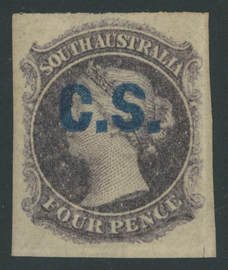 BLUE OVERPRINT: 'C.S.' on QV Perkins Bacon Large Star Wmk Rouletted 4d slate-purple SG DO143, rouletting except at left but cut from the sheet clear of the design on all sides, large-part gum, Cat £1100. Rated RRRR. Ex Colonel Napier (II). Chris Ceremuga Certificate (2019) states "extremely rare...superb and fresh". The almost identical 'Besancon' example sold for SFr1570. Absent from Don Pearce's collection. (Image1)