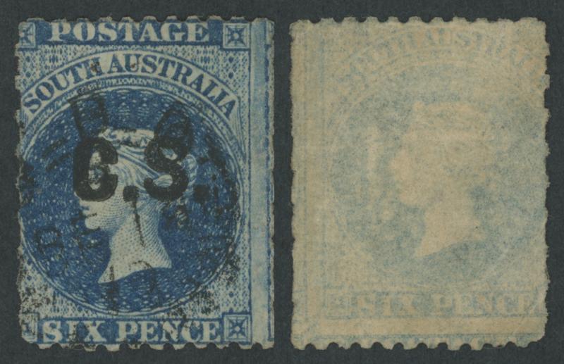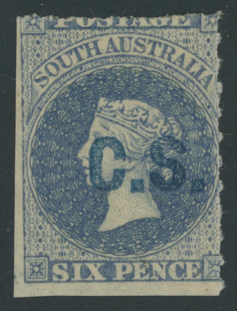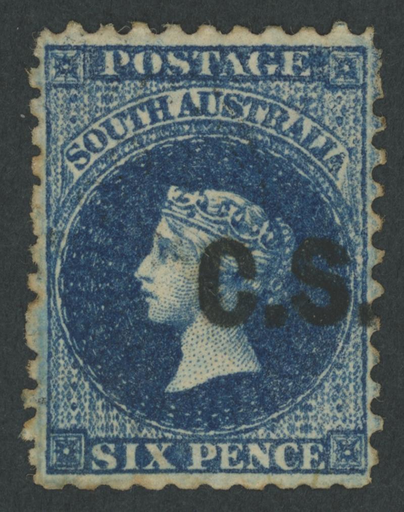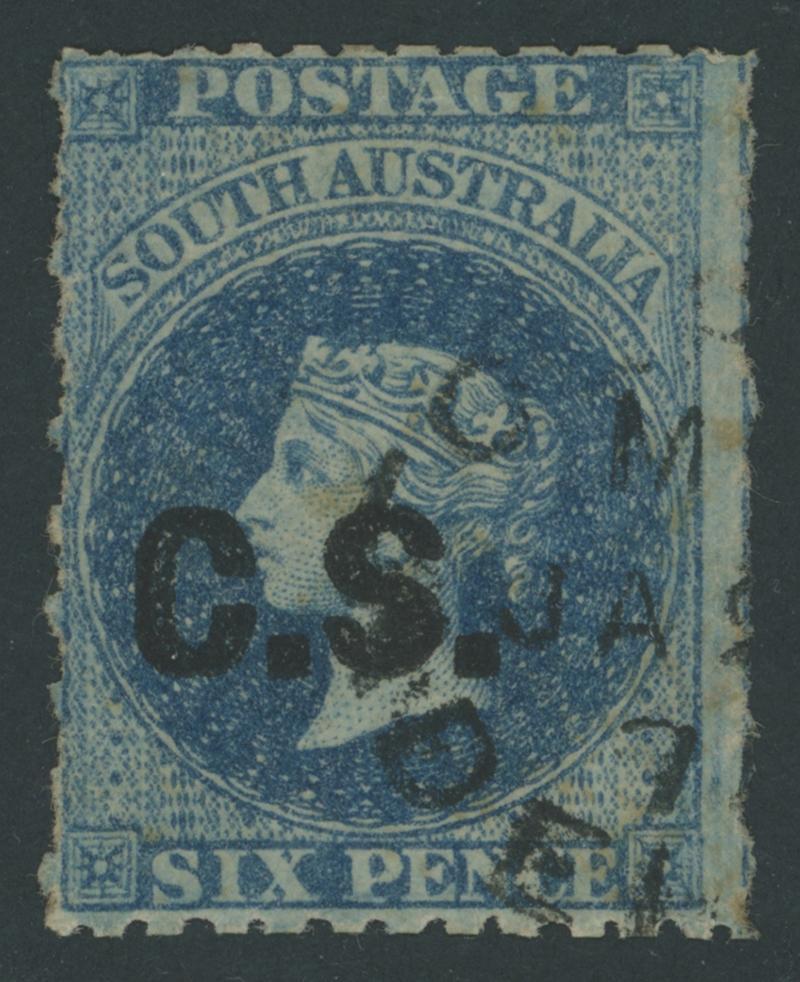 BLACK OVERPRINT: 'C.S.' on QV Perkins Bacon Large Star Wmk Perf 11½-12½xRouletted 6d deep bright blue (not Prussian blue as SG DO148), GPO cds of 'JA-/71', Cat £275. Not recorded by Ron Butler in this shade. Ex Don Pearce: sold for $455 (Sale 247 Lot 108). NB: the shade is the same as SG DO151, that Gibbons list as "bright pale blue". (Image1)