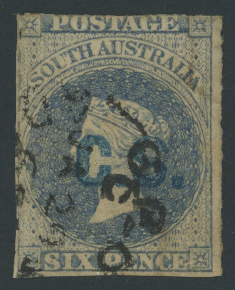 BLUE OVERPRINT: 'C.S.' on QV Perkins Bacon Large Star Wmk Rouletted 6d dull blue SG DO144, rouletting at top & right otherwise cut from the sheet well clear of the design, large-part gum, Cat £1800. Rated RRRR. Ex Don Pearce: sold for $3115 (Sale 247 Lot 94). The 'Besancon' mint example sold for SFr3630. (Image1)