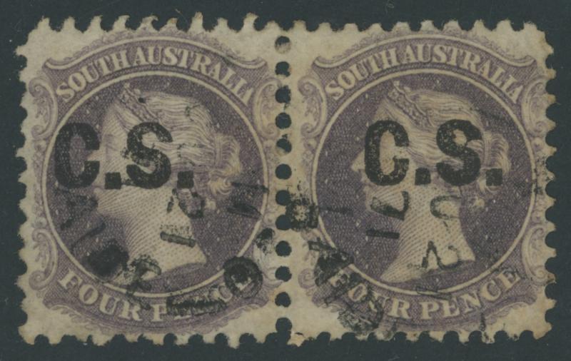 BLACK OVERPRINT: 'C.S.' on QV Perkins Bacon Large Star Wmk Perf 10 4d slate-violet SG DO154 horizontal pair, a couple of tiny & insignificant tonespots, GPO cds of 'OC21/71', Cat £200+ for singles. Rated S+ for singles. A very scarce multiple. Ex Don Pearce: sold for $347 (Sale 247 Lot 103). [Date range 30.11.1870 to 15.12.1871] (Image1)