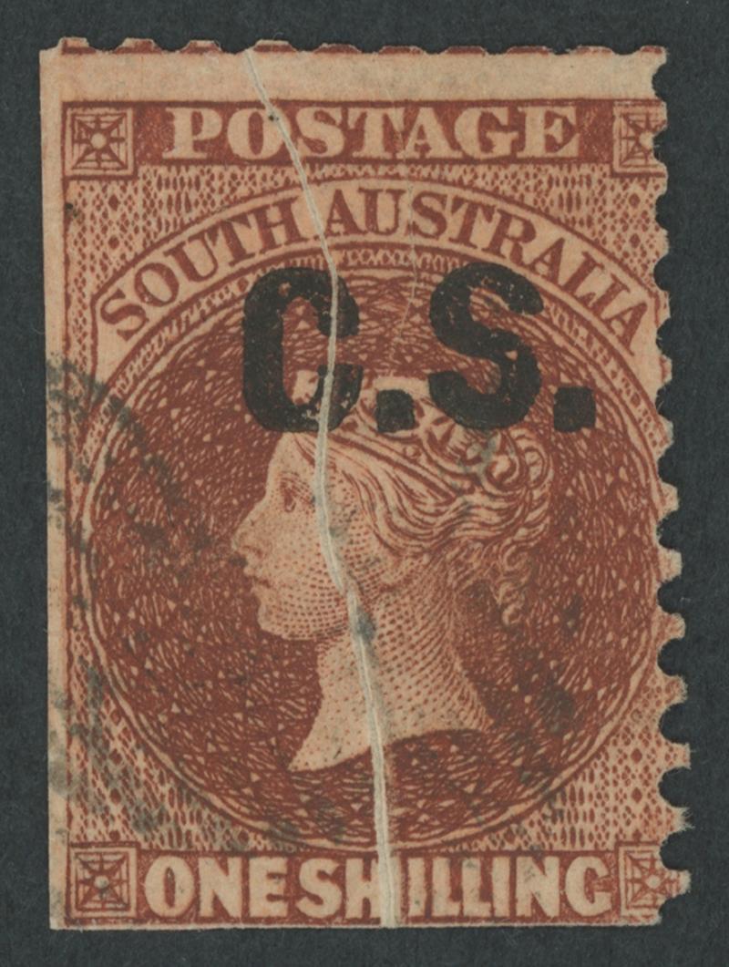 BLACK OVERPRINT: 'C.S.' on QV Perkins Bacon Large Star Wmk Perf 10 1/- red-brown on brownish tinted paper SG DO156 with Crack across 'C' in 'C.S.', indistinct GPO cds, Cat £100+. Rated S+: unrecorded unused. Ex Don Pearce: sold for $150 (Sale 247 Lot 111). [Date range for the normal stamp 3.1.1872 to 23.3.1873] (Image1)