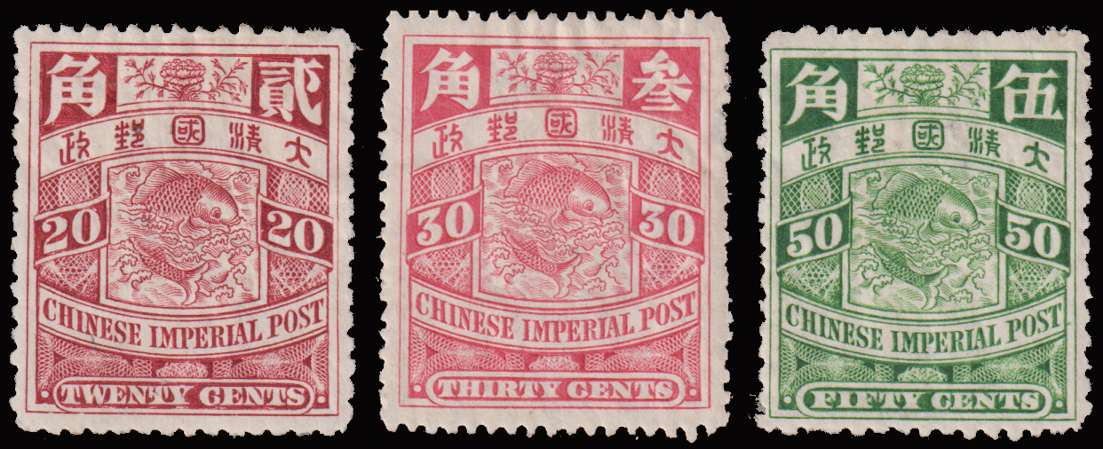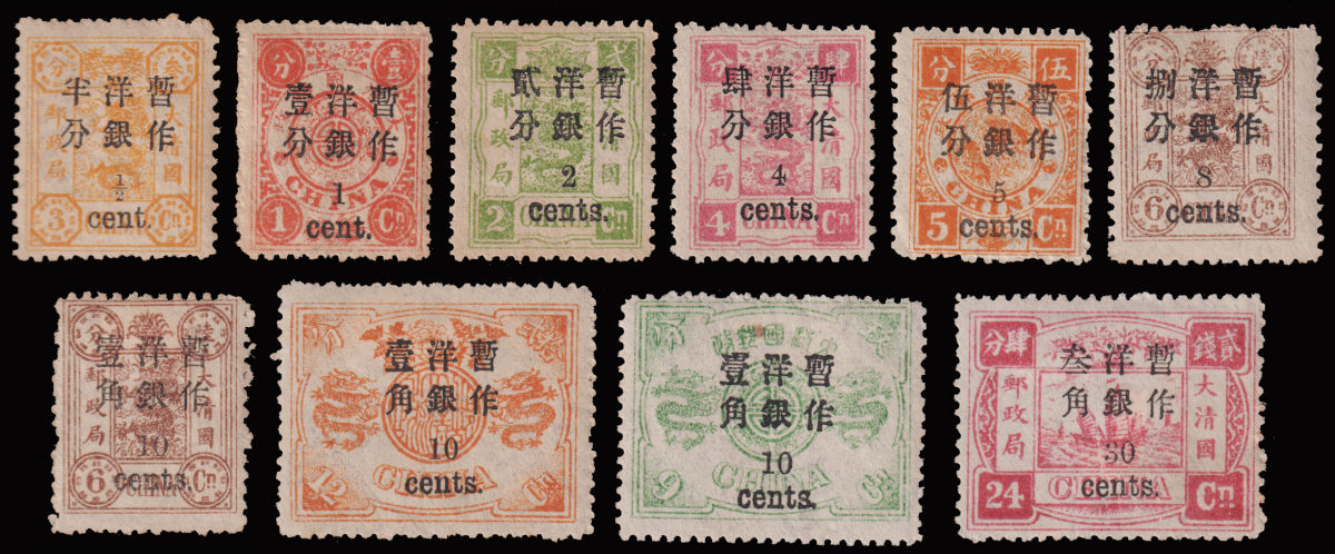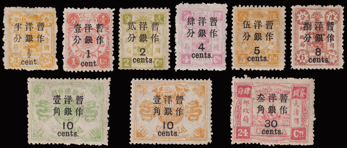 1909 First Year of Emperor Hsuan T'ung set unused, no gum, 3c thin on reverse, plus 20 used Coiling Dragon stamps. $0 (Image)