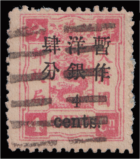 According to our knowledge "FUSAN CUSTOMS / MAIL MATTER" marking was only seen on a 5 candarins Large Dragon thin paper stamp before, like this one with light blue-violet color. Among the three Chinese Imperial Customs Post offices, Seoul, Jenchuan and Fusan in Korea used CUSTOMS / MAIL MATTER markings, the "FUSAN CUSTOMS / MAIL MATTER" marking is the rarest, only two stamps including this copy and two covers (one with doubt) have so far been found. $0 (Image)