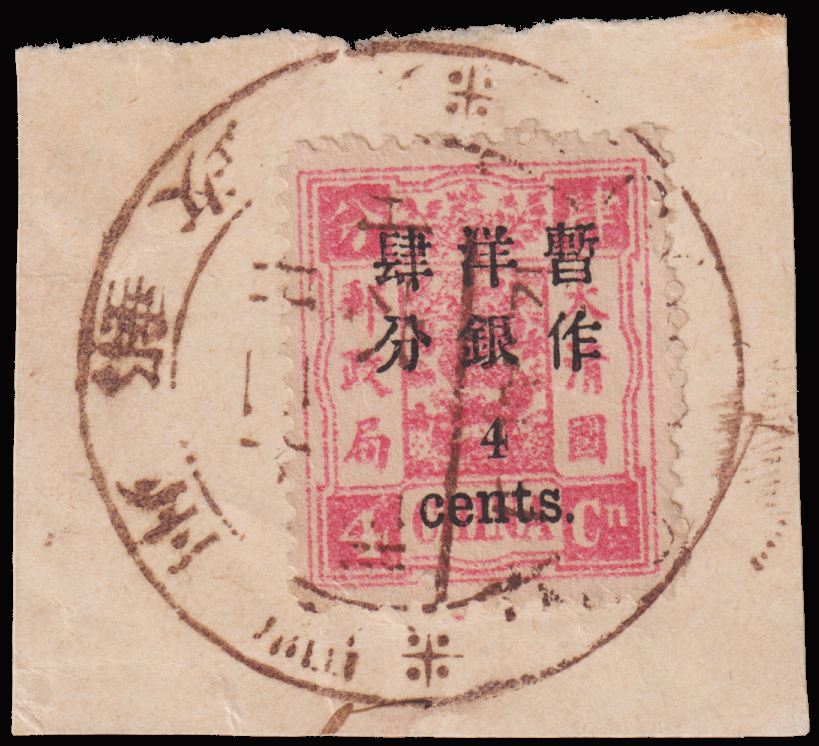 1897 Surch on 1st print Dowager Jubilee with small figure 4c on 4ca used on piece with full Foochow 12.JUL.97 Large Dollar dater, an early usage of Foochow Large Dollar dater. $0 (Image)