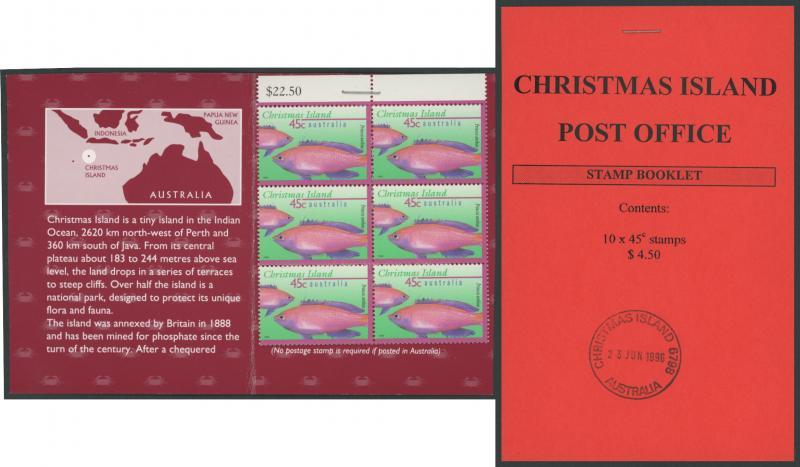 1995 Provisional Booklet (maroon card) with 45c Fish block of 10, not listed or priced; and 1996 black/red cover with 45c Fish block of 10 SG SB1a stapled at top, Cat £650+; both with cds on the cover face. (2) (Image1)