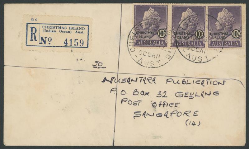 POSTAL HISTORY: 1959-64 Australian Postal Agency Malayan Currency commercial mail to Singapore with No 2 cds cancels comprising 1) 1959 oversized envelope (280x128mm) with QEII 5c mauve x3; 2) 1960 with QEII 10c violet solo; 3) 1960 registered with 5c mauve pair on face & block of 4 on reverse and 'ALEXANDRA/SINGAPORE' arrival cds; 4) 1961 registered with QEII 10c violet x3 and 'GEYLANG/SINGAPORE' arrival cds; and 5) 1961 usage of Registration Envelope QEII 30c red (roughly opened at right with tear into value indicia); the registered items with Australian-pattern 'CHRISTMAS ISLAND/(Indian Ocean) Aust.' blue/white R labels.