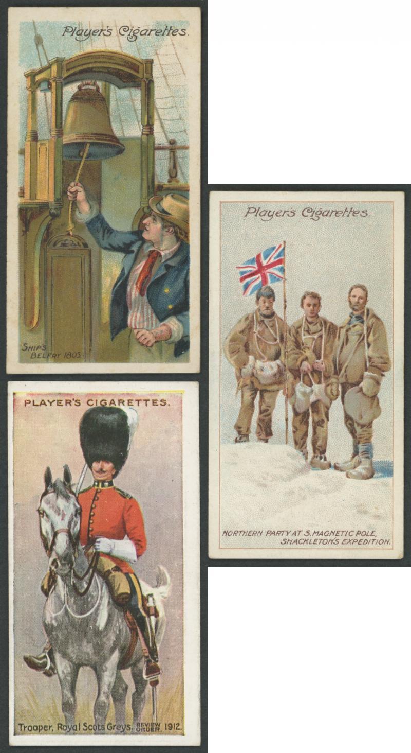 John Player & Sons 1905-1980 sets in leaves, mainly military & naval, including 1905 'Life on Board a Man of War' [50]; 1907-10 Regimental Colours and Cap Badges' [100]; 1912 'Regimental Uniforms' [50]; 1914 'Regimental Uniforms' [100]; 1915-16 'Polar Exploration' (1st & 2nd series) [50]; 1924-25 'Army, Corps and Divisional Signs 1914-1918' [150], mainly Fine/Very Fine. Cat £1340+.