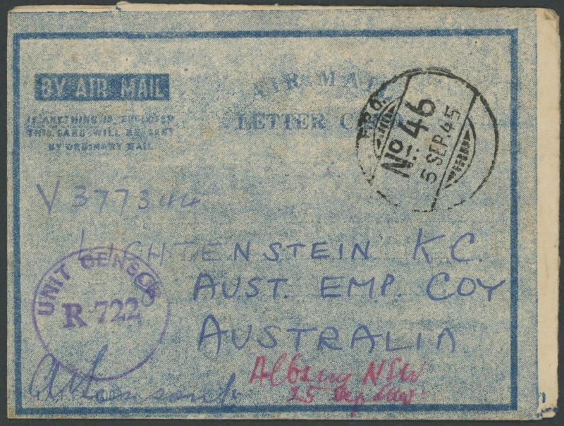 1945 (Sep 5) Indian-pattern 'AIR MAIL/LETTER CARD' to Australia with unusually fine strike of the Indian-pattern 'FPO/No 46' cds used on Cocos, to a member of "8 Aust Emp Coy/AUSTRALIA", self-censored by Lt Alan Benson who states "... the war is over at long last ... air passages are very precious & difficult to get ... could [you] send me a few food parcels ... big stores do the packing & despatch for you ... What an ingenious new name you have chosen ...", a bit of wear. Virtually all such items seen are addressed to Britain. This is presumably addressed to a Jewish refugee 'Dunera Boy', who were sent from Britain aboard the infamous 'Dunera' to internment camps in Australia. Hundreds were released to serve with the Australian Army's Employment Companies, where many of them anglicised their names. Sold at our online auction Number 7 for $718. (Image1)