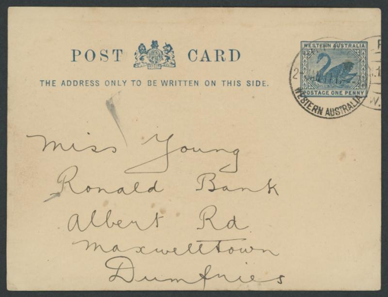 TELEGRAPHIC MESSAGES ON POSTAL CARDS: 1911 (Jan 2) use of Western Australia 1d with No Frame on Unsurfaced Stock, to Scotland with Perth cds of 2JAN11, minor aging. Ex Colin Riddell: sold at our auction for 3.3.2019 for $898. Most such usages are on more common issues, and to Malta. (Image1)