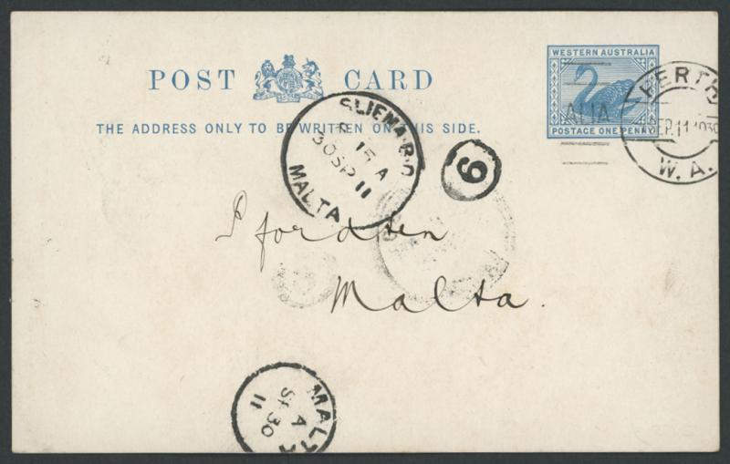 TELEGRAPHIC MESSAGES ON POSTAL CARDS: 1911 (Sep 3) usage to Malta of Western Australia 1d on Highly Surfaced Stock with Perth machine cancel, 'MALTA' transit, 'SLIEMA BO/MALTA' arrival & '6' (or '9')-in-circle postman's handstamp all on the face, the brief message headed "Cocos/3.9.11". Sold at our auction of 14.8.2010 for $932. There was no post office on Cocos until 1933. (Image1)