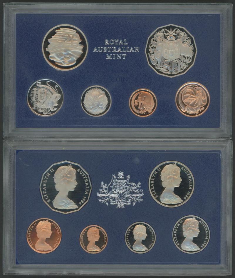 Proofs in box comprising 1984 $1 x4, 1988 $5 Al/Br x14, Six-Coin sets with 1983-84 x2 and 1985 x3 (no outers), 1989 x5 with outers; and 1983 Six-Coin Unc set x3; plus 50c cased collection (6) with 1966 round, some damaged packaging. (34 items) (Image1)