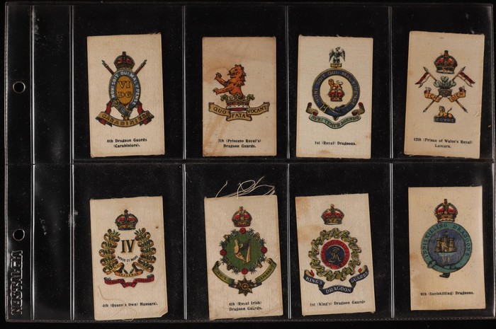 Military British Regimental Badges. Part set of 64/110 diff silk cards with blue descriptive texts on rev as issued by British American Tobacco Co. VG/F condition cat £3.50 ea = £224 = A$440. (Image1)
