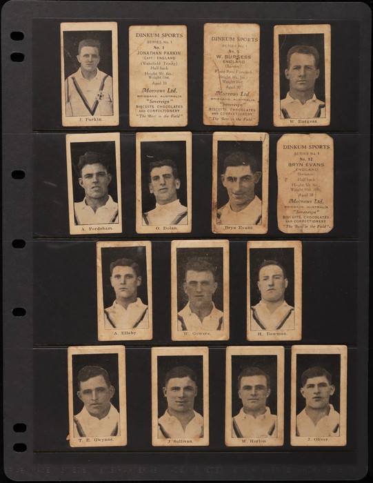 Rugby - 1928-30 English: Morrows Ltd (Brisbane) Dinkum Sports Series 1 trade cards with 12 diff plus 3 extras inc J Parkin (Captain), W Burgess, A Ellaby & B Evans. Few flts, some staining. Generally VG/Fine condition. (15) (Image1)