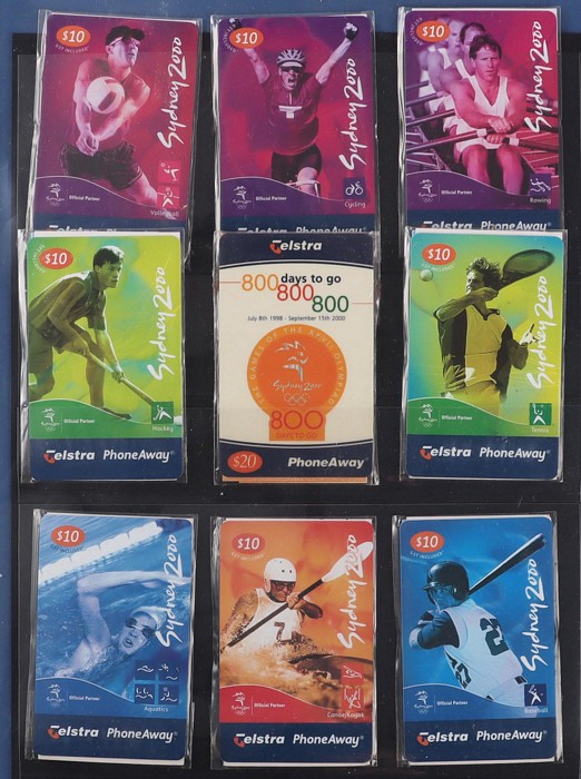 Phonecards: Small carton lot with 1994 AFL Classic Auction Tony Modra $2 limited pack (20). 1990s Telstra trade show/exhibition cards (12 mixed). GB Judge Dread limited edition packs (17 diff). Telstra 2000 Sydney Olympics $10 card sets (2) plus extras. Mostly Australian issues, mixed U/UN with FV $530 for the UN Olympic cards & assorted Telstra soft plastics. (600+) (Image1)