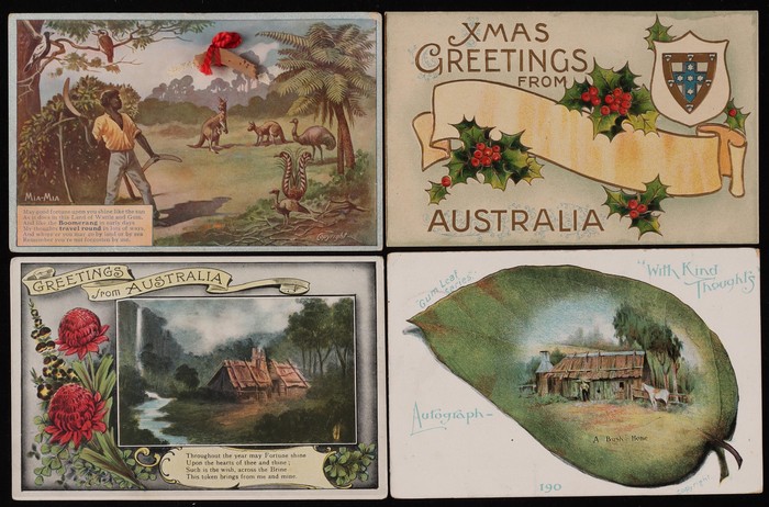 Australia: Collection classic period on with Nationalistic Greetings (30) inc Bush Scenery, Gum Leaves & Heraldic Shields. Australian Industry inc Sheep Stations, Mining, Timber Cutting & Bush Huts plus Sun Downers set of 6. Artist cards (5), Ships (4) plus 1960s Ford Falcon Advertising cards (6). Mixed UN/U, F-VF. (70) (Image1)
