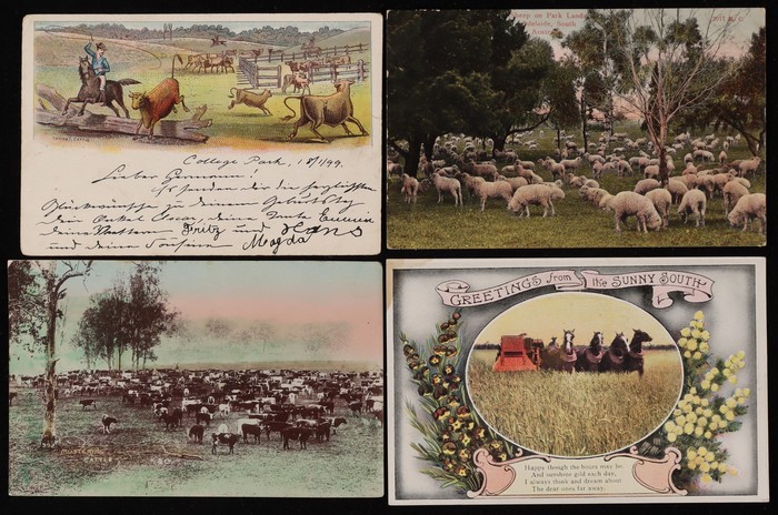 Australia: Neat early 1900s collection with generic types (36) inc stunning 1899 South Australia Stockyard chromo-litho, River Murray Scenes, Bush Views, Rural Industries. Then Queensland (8), NZ (8) inc Auckland or Wellington Scenes. Tasmania (14) inc Hobart, Mount Ida, Queenstown Smelters & River Tamar. Western Australia (9) inc Barrack St Perth, Fremantle Oval & Emu Point (1950s real photo). (75) (Image1)