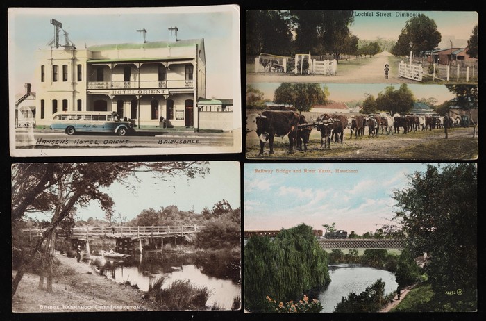 Australia - Victoria: Early 1900s concise collection (40) inc Bairnsdale Hotel Orient, Dimboola Scenes (4), Kannanook Creek Frankston, Hawthorn Railway Bridge, Melbourne (9) inc The Block, Princess Theatre, Queen's Bridge & Spring St, Mildura (8) inc Deakin Ave, Railway Station, State School & Coffee Palace. Plus others inc Advance Australia Heraldic Shields (2) & VIC Railways Buchan Caves card. Also 2 1960s Geelong Ford Falcon advertising card. Mixed U/UN, generally F-VF condition. (42) (Image1)