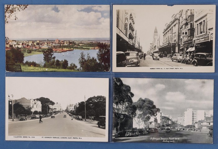 Australia - Western Australia: Small collection (40) early 1900s to mid 1960s inc Perth from Kings Park, Hay Street Perth, St Georges Terrace Perth (2 diff), Wellington Street Perth, Chaffers Plant Kalgoorlie, Emu Point Albany, Geraldton Looking West, Hannan Street Kalgoorlie, Middleton Beach Albany & The Mint Perth. Also 1940s/50s real photos (26) inc Valentines Snapshot set of 12 & 1913 1d grey Kangaroo Scenic Lettercard with Zoological Gardens pictorial on rev. Mixed UN/U, mostly F-VF condition. (66 items) (Image1)