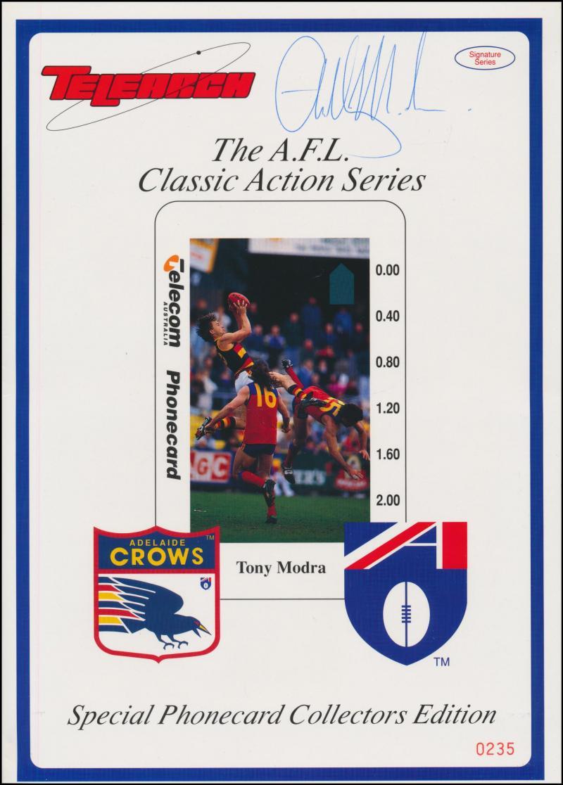 Balance of collection circa 1993-2019 AFL cards (9000+); Tony Modra phonecard folders signed (2); AFL covers (80+); Grand Final supplements (35); 1960s-70s trade cards (1000+); NBL cards (220); golf balls (12); signature of Jon Voight, mainly Fine condition.