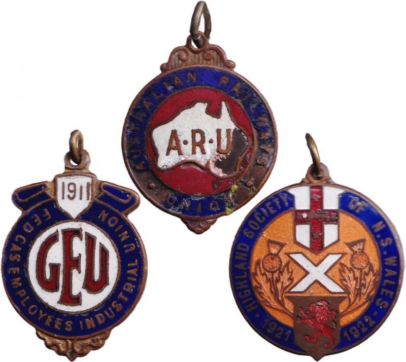 Badges Collection including 1911 Fed Gas Employees Industrial Union; Australian Railways Union; Highland Scociety of NSW 1921-22 & 1929-30; Australian Air League; military with 2/16 Battalion 'sweetheart' pin; cricket with MCC 1950-51 & 1950-51 Argus badges (6); football (11) with Geelong West FC 1922 & Dustin Martin 200th AFL Game; 1956 Olympic Games flags tin badges (22); MJRU 1931, mainly Fair/Fine condition.