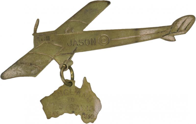 Badges commemorative badge 71x38mm in brass recognising Amy Johnson's flight from England to Australia in May 1930. Very fine and extremely rare. [Amy Johnson was the first woman to fly solo from England to Australia]. (Image1)