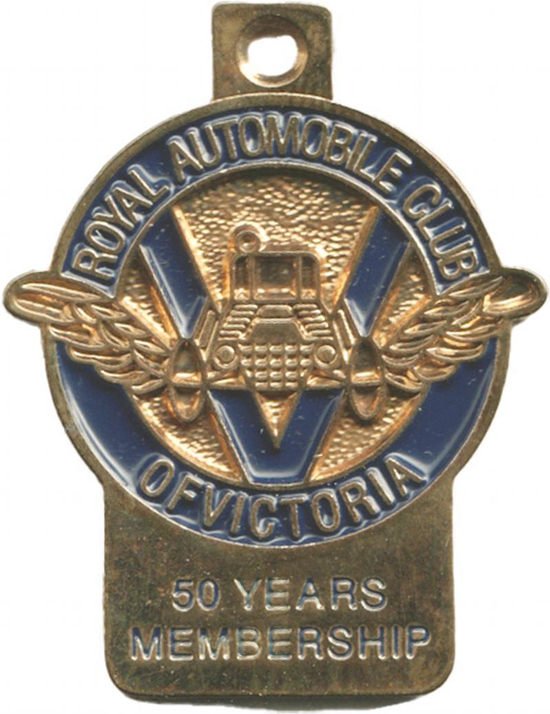 Badges collection including 'Royal Automobile Club of Victoria/50 Years Member'; 'Country Fire Authority/Long Service'; horse racing with VRC (13), VATC (5), Moonee Valley (5), Ballarat (9), Mornington (3) & others (4); Lawn Bowls (76); Ford 50th Anniversary (10) & key rings (9); military (9); medals with Defence Medal & 1939-45 Star plus miniatures; medallions; also Royalty with Bell's Whisky decanters (3) & small plates (2), mainly Fair/Fine. Inspection will reward.