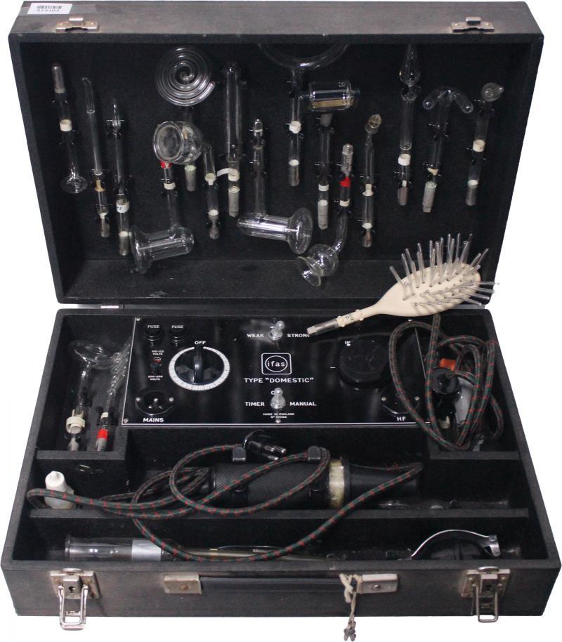 Medical cure for everything from warts, epilepsy, jaundice, herpes, to sexual debility, plus beauty culture by means of violet ray high frequency current (?), cased (475x320x150mm) with glass electrodes for eye, breast, skin, throat, nose, rectum, vagina, (doctor's supervision only), etc, includes 78pp instruction manual and testimonials. (Image1)