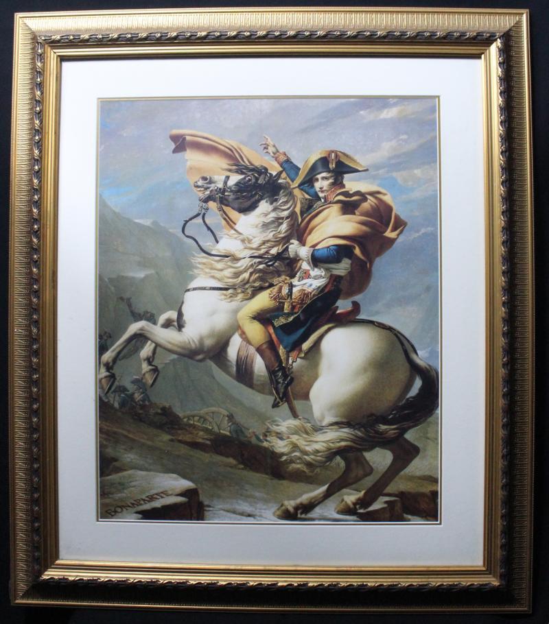 Napoleon framed prints 'Napoleon Bonaparte, First Consul, crossing the Alps' window mounted, framed & glazed, overall 83x96cm; plus BFI movie poster 'Napoleon' (2000 showing of restored 1927 movie), window mounted, framed & glazed, overall 118x80cm.