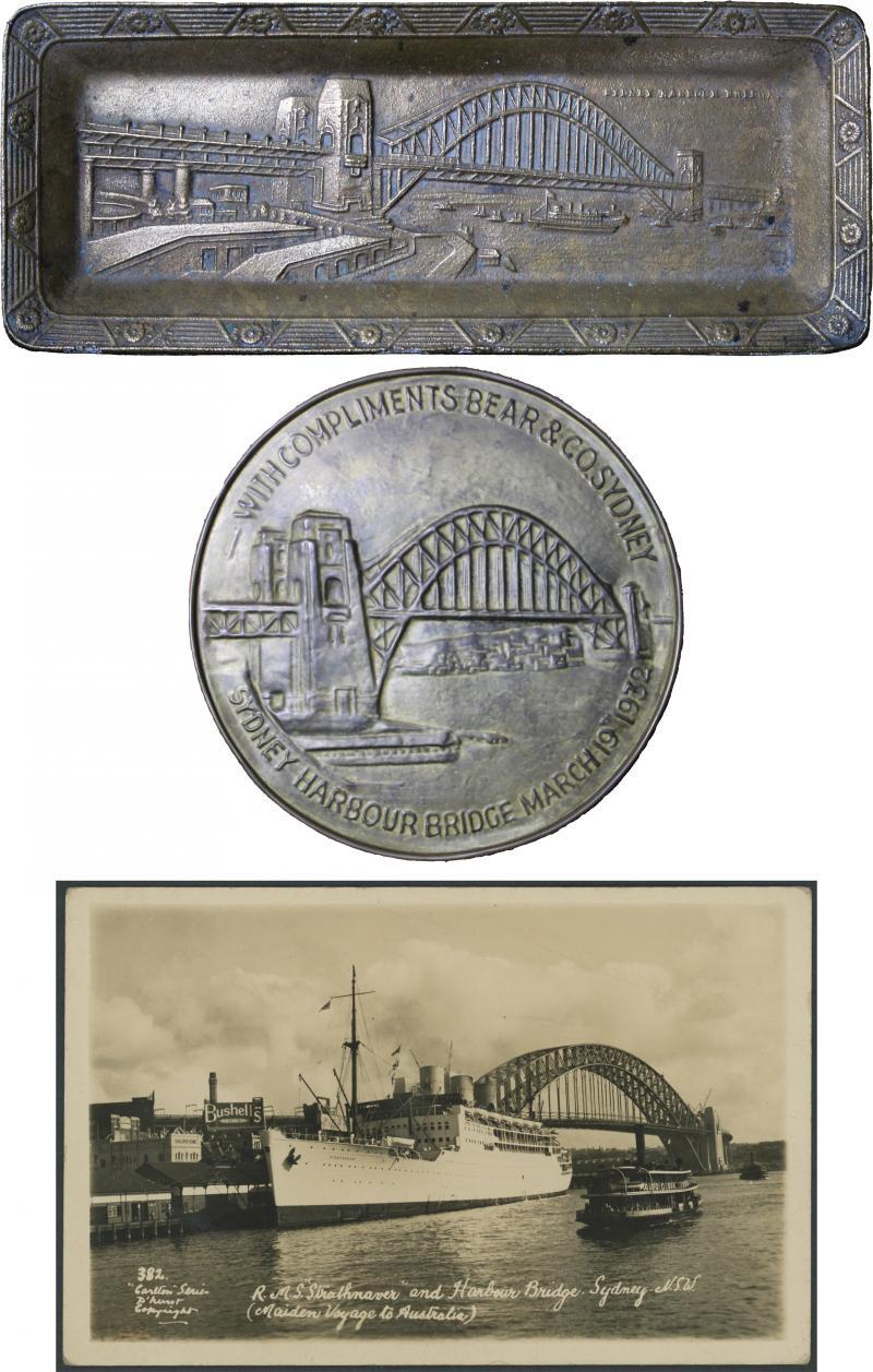Sydney Harbour Bridge collection including postcards (320+); view folders (36); photographs (60+); ephemera (50+); philately (16); playing cards (59); trade cards (15); phone cards (42); ceramics (25); glassware/ashtrays (10); celluloids (12); ties (3); bottle/can openers (14); toasting fork, car badge, horse brass, blotter, wallet, metal tray, belt buckle; spoons (16); match box covers (20), matchboxes (16); cigarette cases (2); place mats (6); coasters (6); wall plaques (3); serviette rings (15); badges (20+); cloth badges (7), mainly Fair/Fine. Inspection will reward.