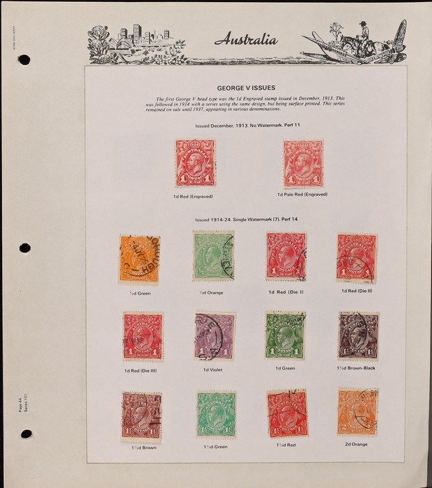 1913-65 Used collection in Seven Seas hingeless album with Kangaroos 1st wmk set to 2/- brown inc 5d CTO Melbourne, 2nd wmk 2d, 6d & 1/-, 3rd wmk set to 2/- maroon, SM to 2/-, plus 6d chestnut opt OS & CofA to 5/- inc 6d opt OS. Total ACSC cat $1200. KGV (58) with 1st wmk to 1/4 inc 1d red Dies II & III, 4d lemon & 4d blue. LM wmk 1d carmine, SM wmk to 1/4 inc 4½d Die II, CofA wmk set & OS opts to 5d brown. Odd CTO, mostly F-VF U, cat $700. 1914 Kookaburra 6d Engraved VFU, 1931 Kingsford Smith set to 6d brown, plus 2d & 6d opt OS. 1932 Bridge 2d, 3d & Lyrebird 1/- all opt OS. 1934 VIC Centenary sets to 1/- (both), 1935 ANZAC 1/- & KGV Silver Jubilee set to 2/- UN. 1937 KGVI set of 22 inc Robes 5/-, 10/-, £1 thick & thin papers UN, cat $280 as M. 1949 Arms set F-VFU. Pre-dec QEII comp inc 1959 Pics to 5/- Cattle, white paper, 1964 Navigator set of 8 to £2 & all high val Commems. A solid G-F/VFU collection, total cat $3000. (Image1)