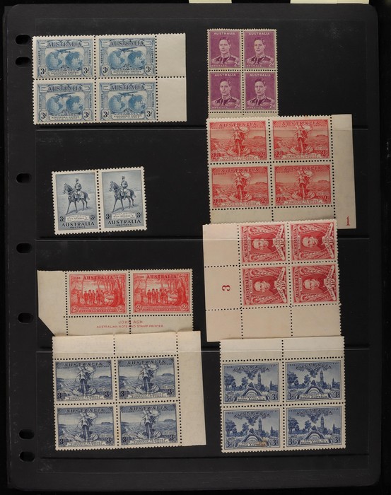 1928-56 KGV, KGVI & QEII collection with duplication on Varios in Lighthouse binder with slipcase mainly in blks of 4 inc imprints, noted 1928 Kookaburra M/S (2), 1930s, Swan, Sturt, Kingsford Smith plate blks, KGV imprints inc 3d & 6d Kingsford Smith, 9d 150th NSW Anniv (2), 1940 AIF set to 6d, range of 1938 KGVI Defs to 1/4 with various imprints, 5/- Robes, both papers, 10/- Robes blk of 4, 1941 QEII Defs, 1952-56 various blks of 4. 3d Kooka (12), 3d Sturt (16), 3d Air (8), 3d Kingsford Smith (12), 6d (10), 3d Bridge (12), 3d VIC Cent (24), 2d Macarthur 'dark hills' (8) inc imprint 3d (12), 3d Cable (10), 3d SA Cent (15), 1/- (11) inc 2 imprint blks of 4, 3d Sesqui (16), 9d (12) imprint blk of 4 (2), 5/- Robes thick & thin imprint blks of 4, 10/- thick (4), AIF 3d & 6d (12 ea), plus most later issues (ex Arms) to 1957 in similar quantities inc 1946 BCOF set ½d to 1/- in imprint blks (2 sets), plus some KGV. MLH/MNH, ome tropicalization etc throughout, mainly F-VF appearance. ACSC cat $7700+. Interesting range with plenty of potential. (1500+) (Image1)