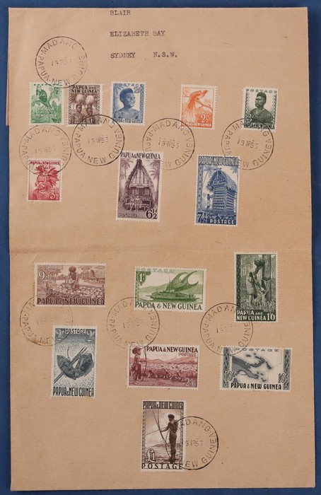 Australian Territories collection in springback album with 1946 'BCOF JAPAN' opt set of 7 M (retail $180). AAT 1957-86 (155) inc 1966 Pics to $1. Christmas Is 1958-76 (90) inc 1958 QEII & 1968 Fish sets to $1. Cocos Is 1963-79 (60) inc 1963 Pics to 2/3 M. Norfolk Is (285) to 1979 inc 1947 Ball Bay to 2/- blue, 1953 Defs to 5/- brown Bridge, 1960 Pics to 10/- Bird, 1966 dec opt set, 1969 Birds to $1 & others mostly F-VFM. PNG (700) to 1979 inc 1952 Defs to £1 Fisherman M & U, 1963 Pics to QEII £1 M & U, 1964 Birds to 10/-, & 1966-79 decimal Pic/Commem sets near comp. F-VFM. (1300) (Image1)