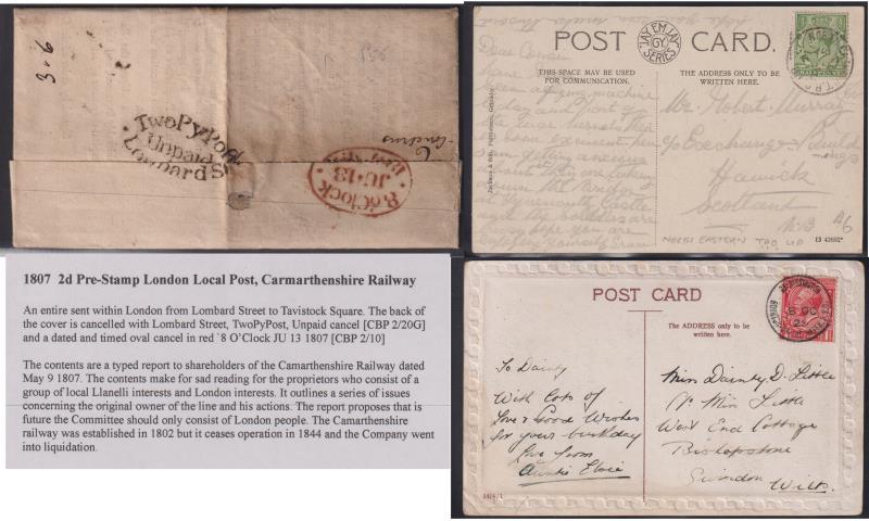 GB 1800s-1920s Railway-related postal/social history colln on Hagner pages extensively written up (typed): a) 1807-1908 entires or covers x 14 addressed to or with contents concerning railway companies in SW England or Wales. Noted items franked QV 1d red-brown imperf SG 8, 2d SG 19 pl 14 (cat £200 on cover), ½d SG 48 pl 10, pl 11 (cat £70 each); b) 1902-29 "R.S.O." (Railway Sub-Office) cds pmks (mostly fine) on 28 PPCs. Noted fine "Gt. Rissington/Bourton-on-the Water R.S.O." cds & other gems (also scarce "North Eastern T.P.O. Up" cds 1914). (Image)